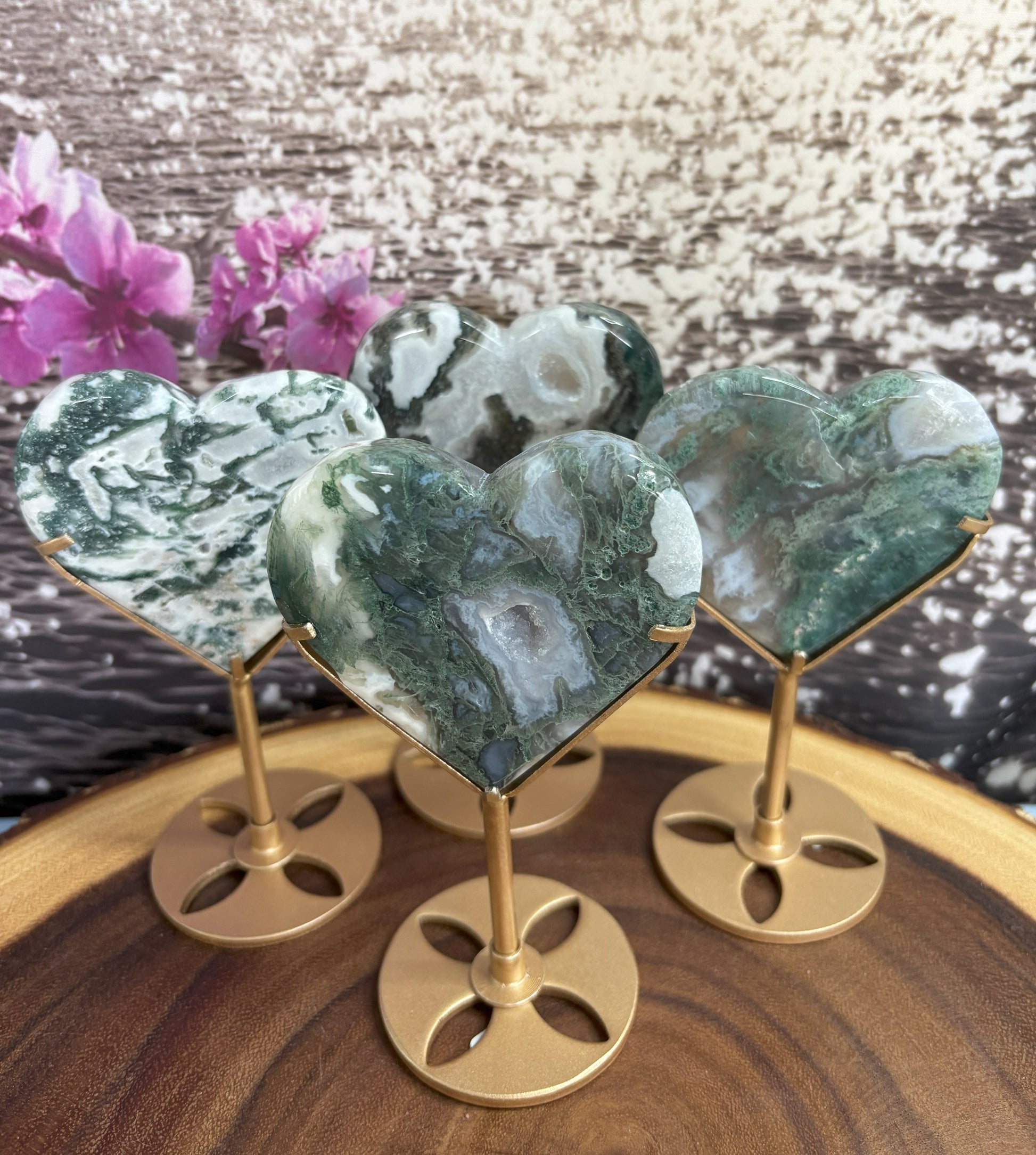 Moss Agate Heart Stands